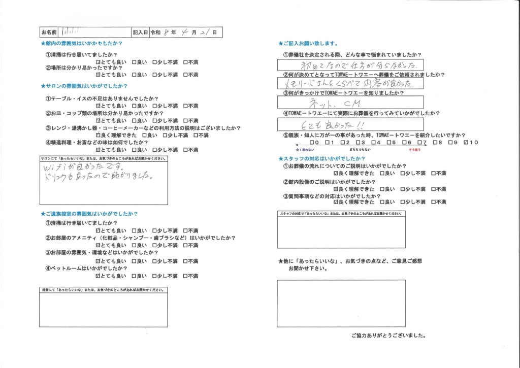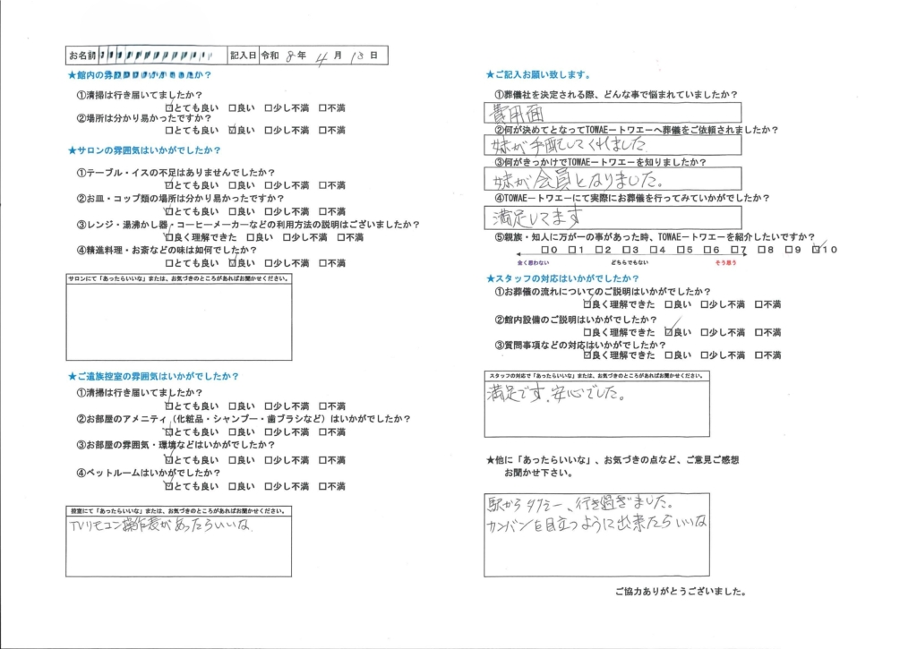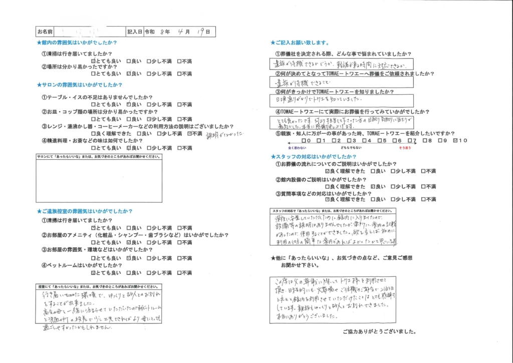 家族葬エピソード2024.08.20実際にトワエをご利用され...喪主:Y様 故人:お父様(86歳) 住所:佐賀...