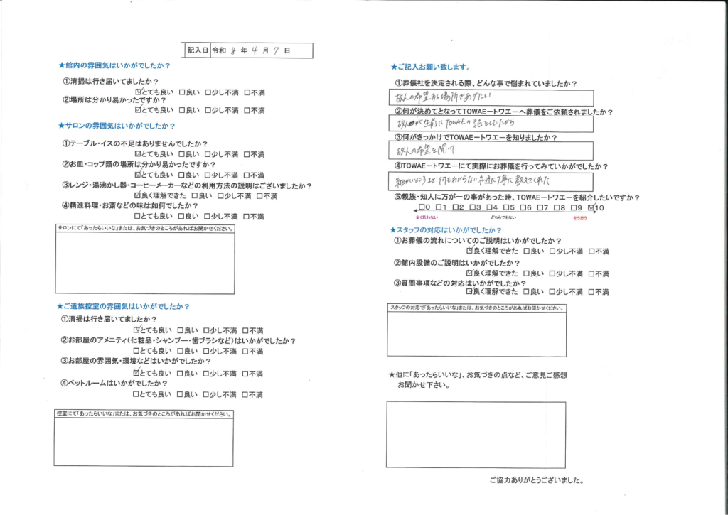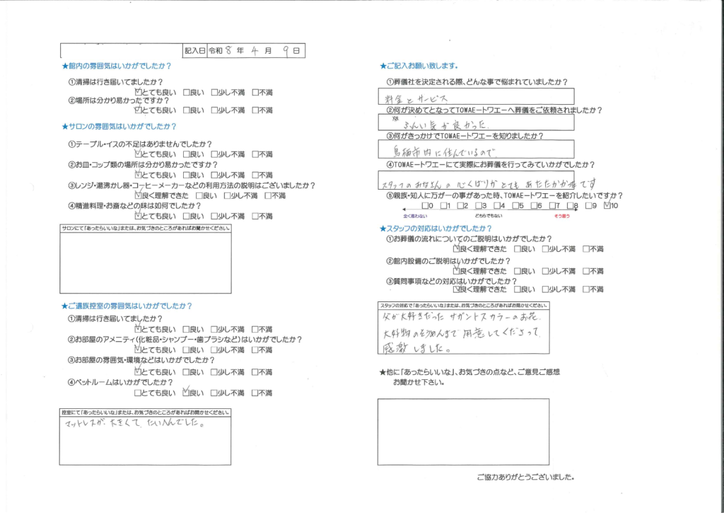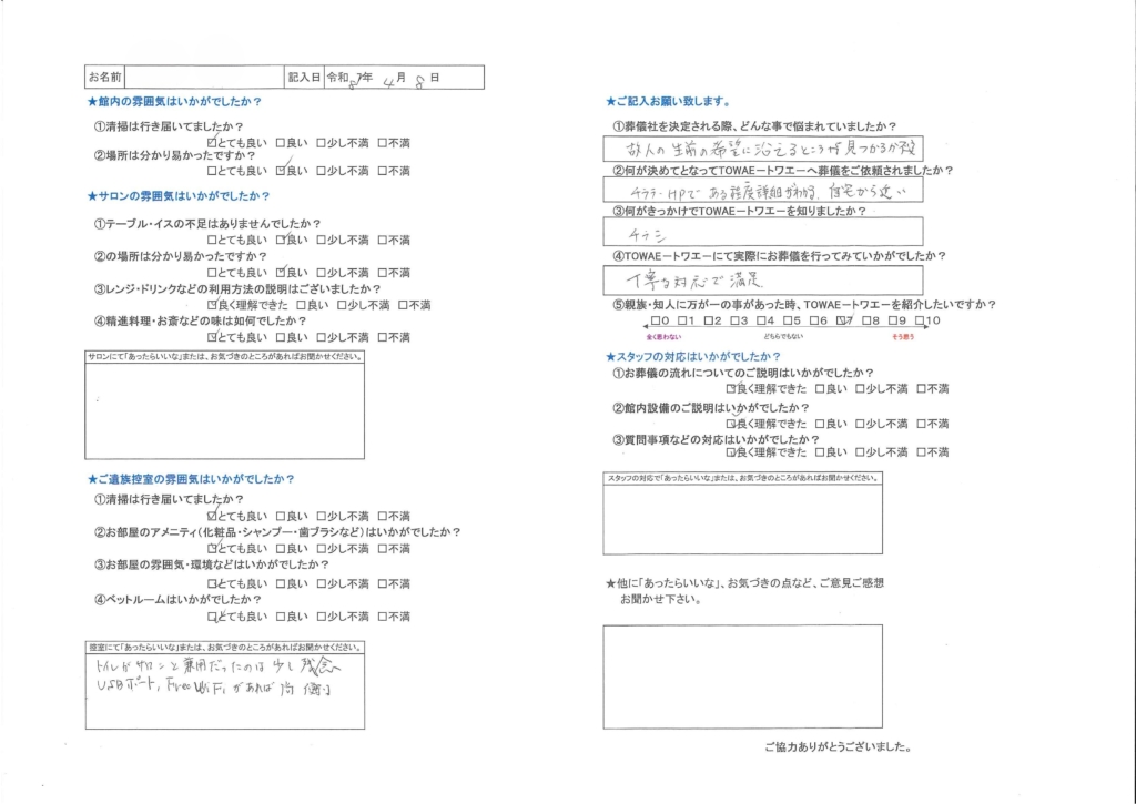 N様、アンケートご回答有難うございます。「スタッフの対応もこちら側の希望を聞いて対応していただきゆっくりと最後の時間をすごさせていただきました。」とのお言葉をいただき有難く存じます。トワエは、お客様のご要望にお応えし、少しでもお別れの時間を大切にお過ごしいただけるようにと願っております。これからも鳥栖市の皆様が安心して1日葬が出来るような葬儀場を目指し努力を重ねます。N様、お忙しい中に貴重なお言葉を頂き誠に有難うご……