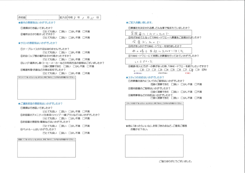 | スタッフより | U様、アンケートご回答有難うございます。「母の時に会員になっており、家族葬にしたかった」との事で、家族葬邸宅トワエをお選び頂き誠に有難うございます。また、ご親族の方からも感謝のお言葉をいただき、スタッフ一同嬉しく思います。これからも鳥栖市の皆様が安心して家族葬やご葬儀が出来るような葬儀場を目指します。U様、お忙しい中に貴重なお言葉を頂き誠に有難うございました。 |