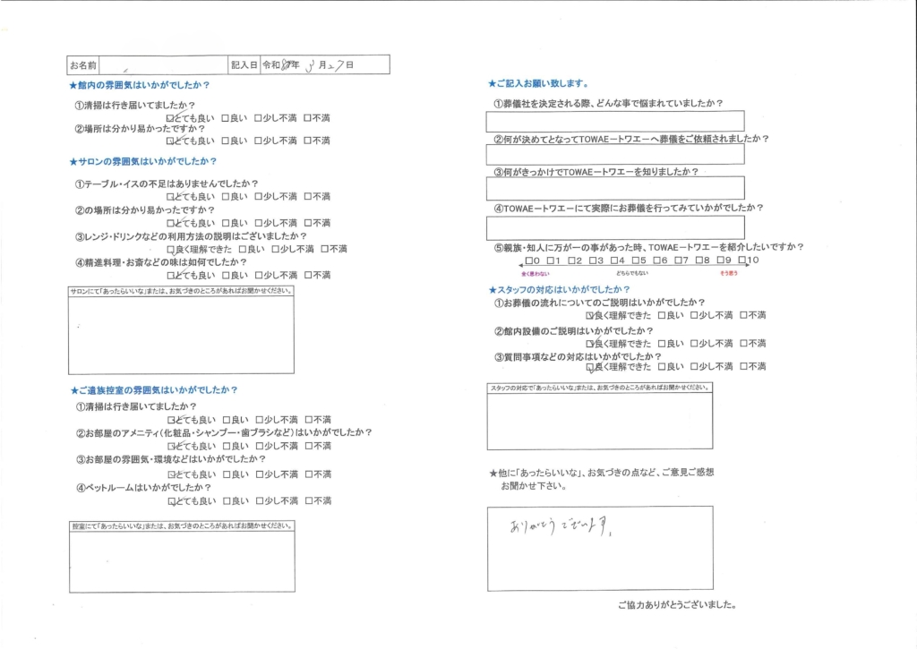 I様、アンケートご回答有難うございます。 この度は数ある葬儀社の中から、家族葬邸宅 末広店をご利用いただき、誠にありがとうございました。 大切なご家族様とのお別れのひとときを、少しでも安心してお過ごしいただけたのであれば、私どもにとって何よりの喜びでございます。 改めまして、この度のご縁に深く感謝申し上げるとともに、ご家族皆様のご健勝を心よりお祈り申し上げます。 故人様の安らかなお眠りを心よりお祈り申し上げます。 I様、お忙しい中に貴重なお言葉を頂き誠に有難うございました。