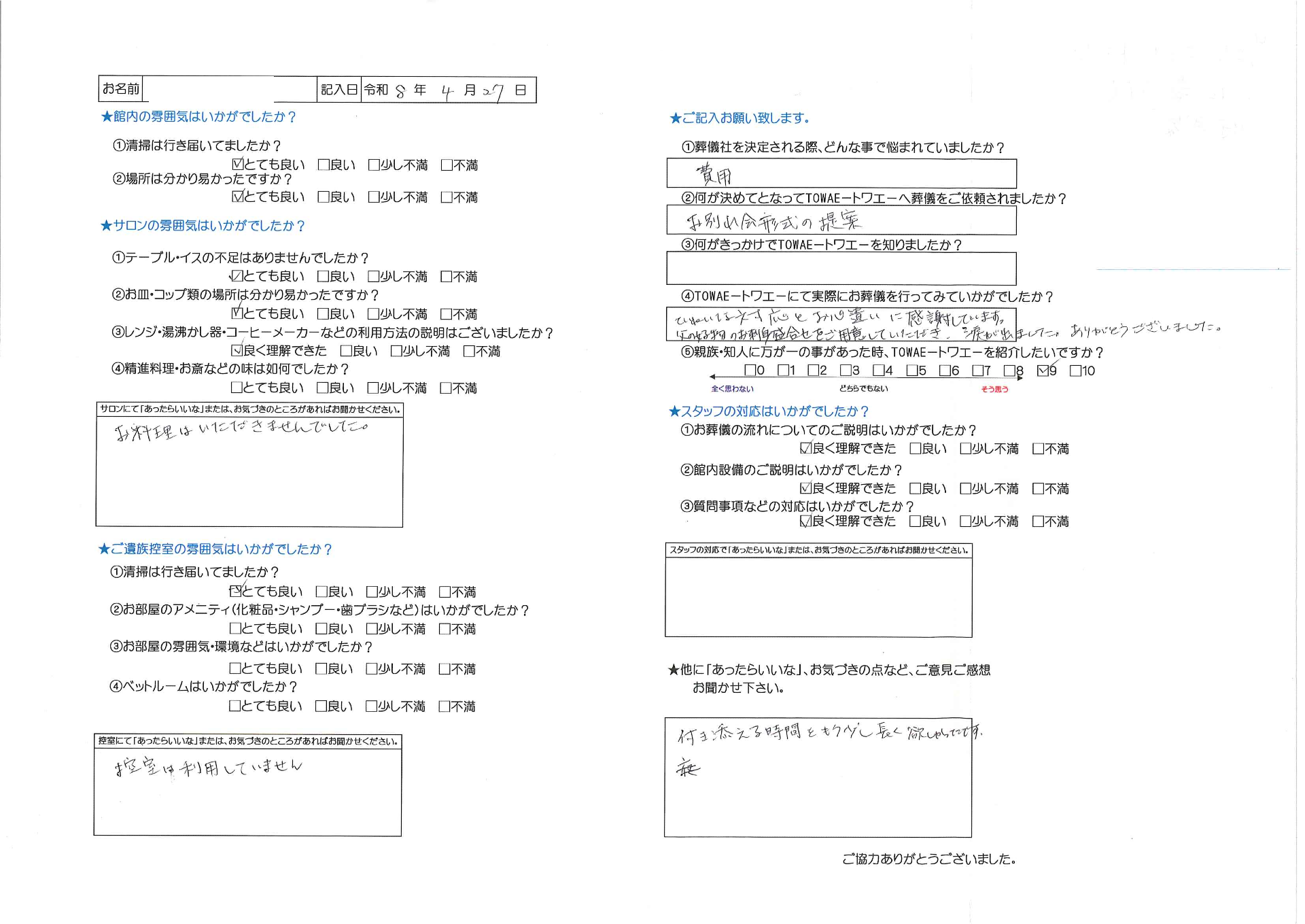 | スタッフより | Y様、アンケートご回答有難うございます。この度は大切なお見送りにTOWAEをお選び頂き誠にありがとうございます。お別れ会形式での一日葬がご家族様にとって故人様らしいお見送りのお時間となりましたことに大変うれしく思います。今後ともご家族様のお気持ちに寄り添い、心を込めたお手伝いができますよう努めてまいります。 |