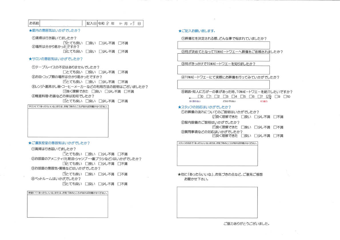 | スタッフより | M様、アンケートご回答有難うございます。このたびは大切なお見送りを私どもにお任せいただき、誠にありがとうございました。お葬儀の流れについてご理解いただけたとのこと、また「とてもよかった」とのお言葉を頂戴し、スタッフ一同心より嬉しく拝読いたしました。慣れない中でのご不安を少しでも和らげられるよう、分かりやすいご説明と丁寧なご案内を心がけておりますので、そのように感じていただけたことは何よりの励みでございます。これからもご家族様に寄り添い、安心してお任せいただけるよう努めてまいります。改めまして、このたびのご縁に心より感謝申し上げます。ご家族様のご健勝をお祈り申し上げます。 |