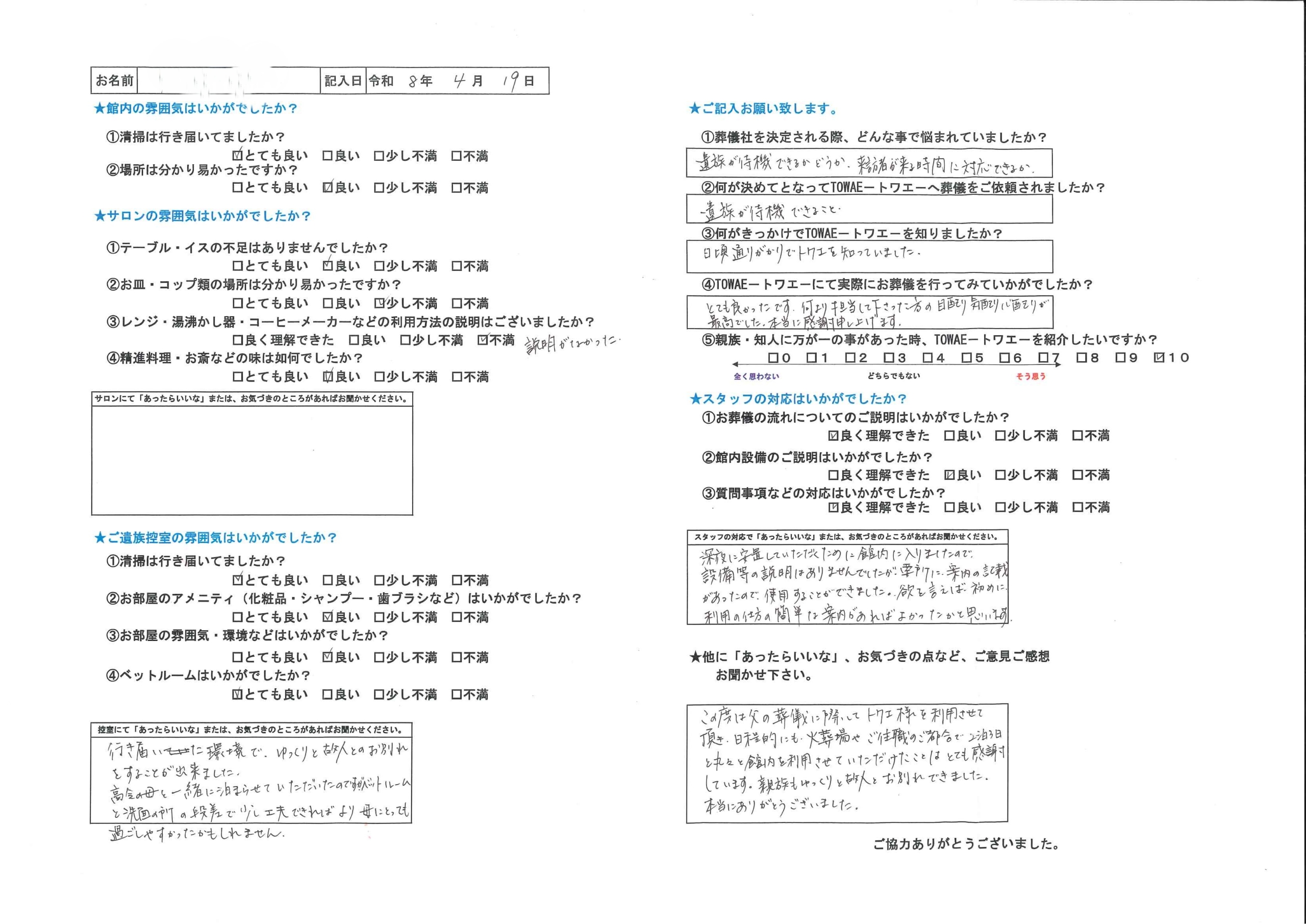 M様、アンケートご回答有難うございます。 このたびは、数ある葬儀社の中から当館をご利用いただき、また心のこもったご丁寧なご感想をお寄せいただき、誠にありがとうございます。 大切なお父様とのお別れの時間を、当館にてゆっくりとお過ごしいただけたとのこと、スタッフ一同、何より安堵し、また大変光栄に存じます。ご家族の皆様が落ち着いた環境の中で、故人様とのひとときを大切にお過ごしいただけたことは、私どもにとっても大きな励みでございます。 また、担当スタッフへの温かいお言葉を頂戴し、心より感謝申し上げます。目配り・気配り・心配りに関してお褒めいただきましたことは、本人はもちろん、全スタッフにとって大きな励みとなります。今後もご遺族様のお気持ちに寄り添ったご対応ができるよう、より一層努めてまいります。 一方で、ベッドルームと洗面所の段差につきまして、ご高齢のお母様にとってご不便をおかけしましたこと、心よりお詫び申し上げます。いただいた貴重なご意見は真摯に受け止め、今後の設備改善やご案内方法の工夫に活かしてまいります。 また、深夜のご入館により設備のご説明が行き届かなかった点につきましても、ご不安やご不便をおかけしましたこと、重ねてお詫び申し上げます。館内の案内表示をご活用いただけたとのことではございますが、ご指摘の通り、初めに簡単なご利用案内をお渡しするなど、より分かりやすいご案内の在り方を検討してまいります。 ご葬儀の日程の都合により、2泊3日というお時間を当館でお過ごしいただくこととなりましたが、その時間がご家族様にとってかけがえのないお別れのひとときとなりましたこと、私どもも大変嬉しく思っております。ご親族の皆様が心穏やかにお過ごしいただけたとのお言葉は、私どもにとって何よりの喜びでございます。 改めまして、このたびのご縁に深く感謝申し上げますとともに、お父様のご冥福を心よりお祈り申し上げます。今後も皆様のお気持ちに寄り添い、安心してお任せいただける式場であり続けられるよう、スタッフ一同精進してまいります。 このたびは誠にありがとうございました。 M様、お忙しい中に貴重なお言葉を頂き誠に有難うございました。