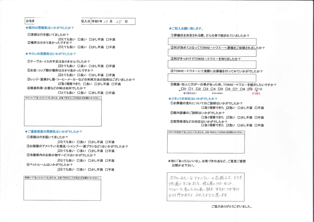 S様、アンケートご回答有難うございます。全ての項目に高評価を頂きスタッフ一同大変嬉しく思います。クローゼットの件ご指摘いただき誠に有難うございます。皆様に快適に過ごしていただけるよう これからもお客様のご要望にお応えし、お客様が安心して出来るような家族葬を目指して努力を重ねて参ります。S様、お忙しい中に貴重なお言葉を頂き誠に有難うございました。 |