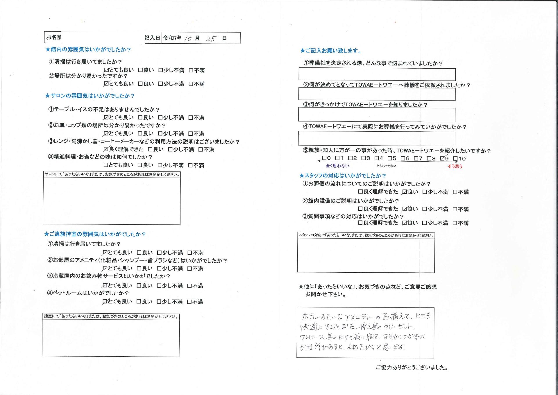 S様、アンケートご回答有難うございます。全ての項目に高評価を頂きスタッフ一同大変嬉しく思います。クローゼットの件ご指摘いただき誠に有難うございます。皆様に快適に過ごしていただけるよう これからもお客様のご要望にお応えし、お客様が安心して出来るような家族葬を目指して努力を重ねて参ります。S様、お忙しい中に貴重なお言葉を頂き誠に有難うございました。 |