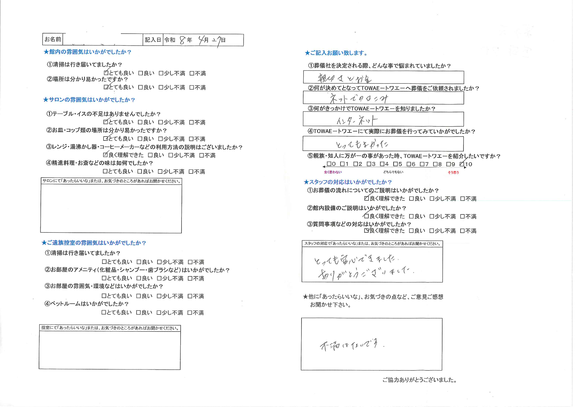 | スタッフより | T様、アンケートご回答有難うございます。大切な方との最後のお別れの際にTOWAEをお選び頂き、誠にありがとうございます。「とっても安心できました」とのお言葉にスタッフ一同嬉しく思っております。これからも「後悔しないお葬式」を提供できるように、心を込めてお手伝いしてまいります。 |