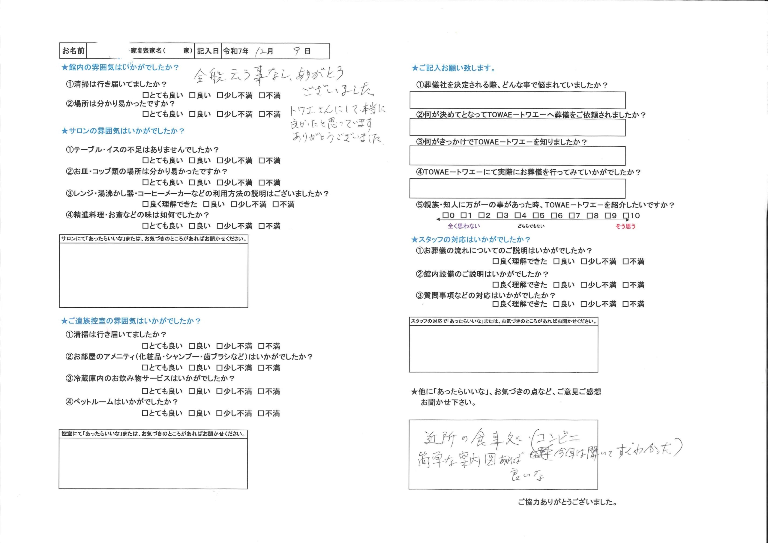 N様、アンケートご回答有難うございます。 このたびは、数ある葬儀社の中から家族葬邸宅トワエ高木町店をお選びいただき、またご多用の中、温かいお言葉をお寄せいただきまして、誠にありがとうございます。 また、アンケートにてご記載いただきました「近所の食事処について、簡単な案内図があれば良い」との貴重なご意見につきましても、誠にありがとうございます。ご葬儀の前後は、心身ともにお疲れが出やすく、また慣れない環境の中でお食事場所を探されること自体が、ご負担となってしまう場合も多いかと存じます。そのような中でのお気づきのお声は、私どもにとって大変ありがたく、今後のサービス向上において重要なヒントとなりました。 いただいたご意見を真摯に受け止め、今後は当館周辺の飲食店を分かりやすくご案内できるよう、簡単な案内図やおすすめ店のご紹介資料の作成を前向きに検討してまいります。ご家族様が少しでも安心して、落ち着いた時間をお過ごしいただけるよう、細やかな配慮を重ねていきたいと考えております。 これからも「ここに任せて良かった」と思っていただける葬儀社であり続けられるよう、スタッフ一同、心を込めたお手伝いに努めてまいります。 N様、お忙しい中に貴重なお言葉を頂き誠に有難うございました。