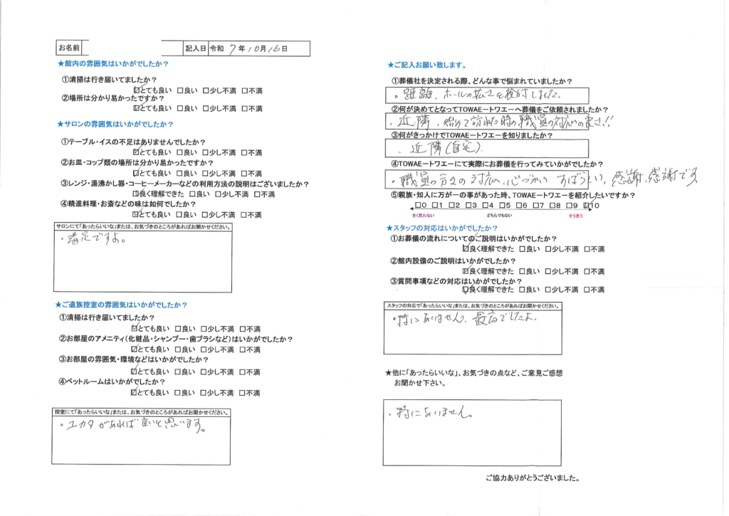 K様、アンケートご回答ありがとうございます。実際にお葬儀を行なってみて「職員の方々の対応、心づかい、すばらしい、感謝、感謝です。」というお言葉を頂きスタッフ一同大変嬉しく思います。また、「あったらいいな」へのご意見をお寄せいただき、誠にありがとうございます。今後のより良いサービスづくりの参考にさせていただきます。皆さまにより心地よくお過ごしいただける空間を目指して努めてまいります。K様、貴重なご意見をいただき、誠にありがとうございました。 |