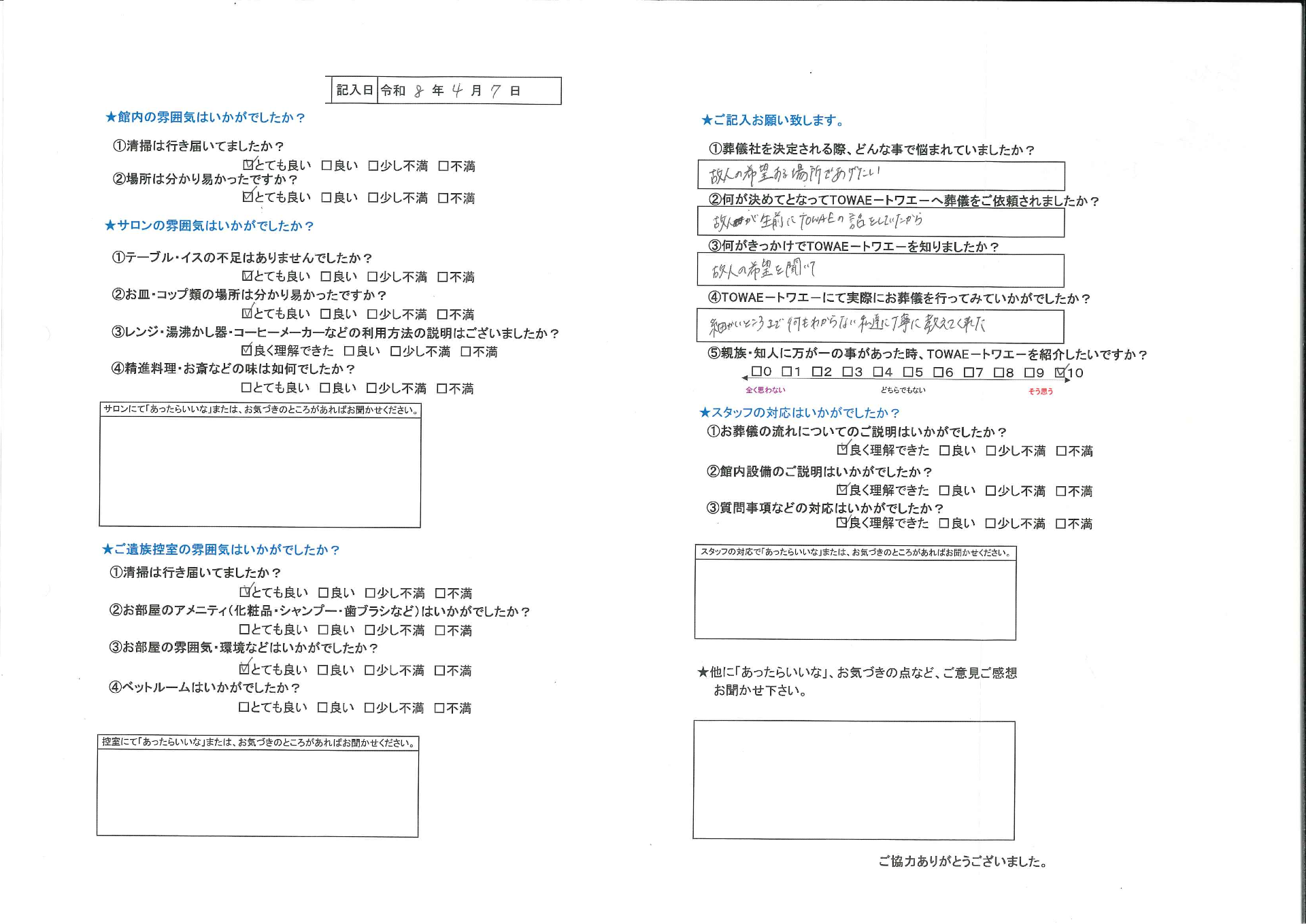 | スタッフより | N様、アンケートご回答有難うございます。「スタッフの対応もこちら側の希望を聞いて対応していただきゆっくりと最後の時間をすごさせていただきました。」とのお言葉をいただき有難く存じます。トワエは、お客様のご要望にお応えし、少しでもお別れの時間を大切にお過ごしいただけるようにと願っております。これからも鳥栖市の皆様が安心して1日葬が出来るような葬儀場を目指し努力を重ねます。N様、お忙しい中に貴重なお言葉を頂き誠に有難うございました。 |