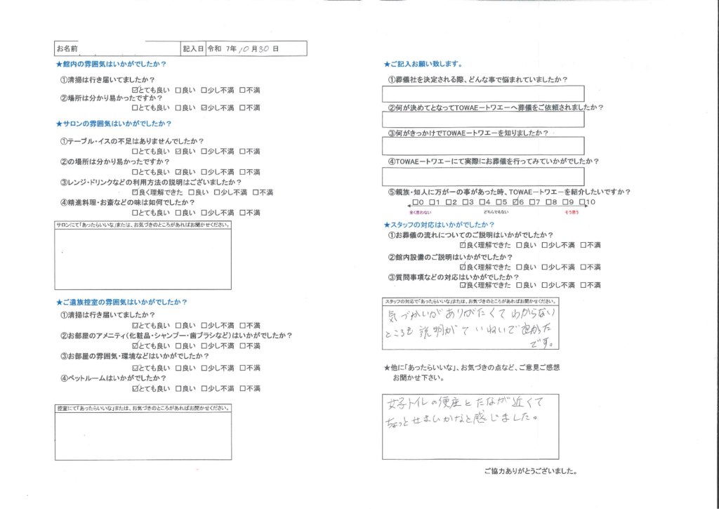 E様、アンケートご回答有難うございます。 この度は、家族葬邸宅トワエ末広店をご利用いただき、また温かいお言葉と貴重なご意見をお寄せいただき誠にありがとうございます。 また、女子トイレにつきまして、便座と棚の距離が近く「少し狭く感じた」との率直なご指摘もありがとうございます。施設の快適さは、お越しいただく皆さまにとって大変重要な点であり、今回いただいたご意見は今後の設備改善の参考として真摯に受け止め、検討を進めてまいります。 お寄せいただいた“あったらいいな”のお気持ちは、私たちのサービス向上にとって大切なヒントでございます。これからも、ご家族に寄り添い、より過ごしやすい空間づくりに努めてまいりますので、何かお気づきの点がございましたら、どうぞ遠慮なくお申し付けください。 この度は貴重なお声をお届けいただき、本当にありがとうございました。心より感謝申し上げます。 家族葬邸宅トワエ スタッフ一同 E様、お忙しい中に貴重なお言葉を頂き誠に有難うございました。