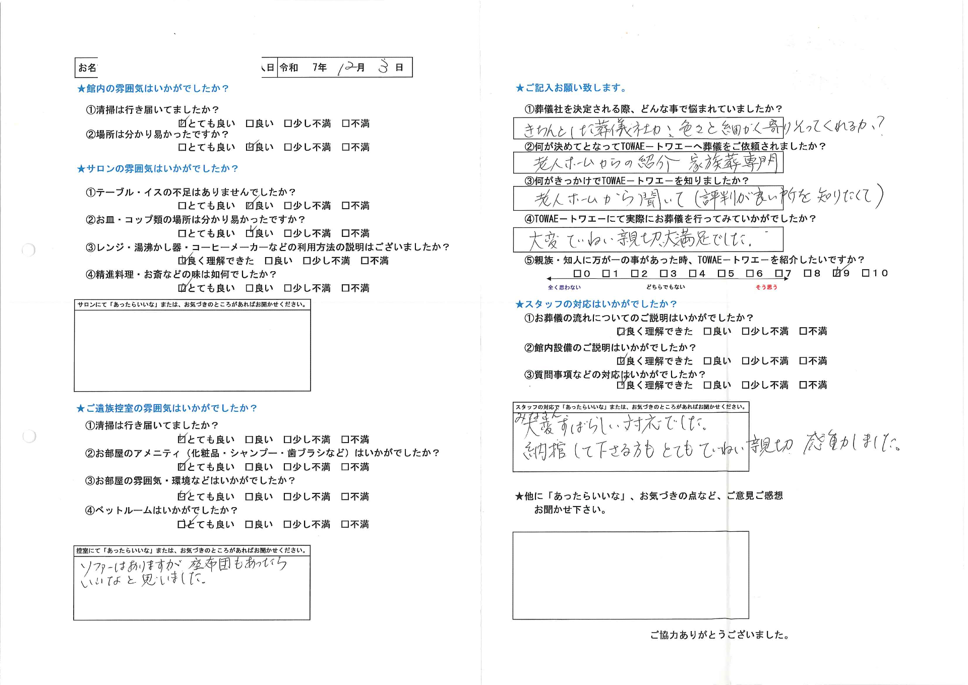 I様、アンケートご回答有難うございます。大変お世話になりました。 数多くの葬儀社がある中家族葬邸宅トワエを選んでいただき誠に有難うございました。「大変ていねい親切、大満足でした」というありがたいお言葉を励みにし、後悔しないお葬式を提供出来る様日々努力して参ります。貴重なご意見誠に有難うございました。 |