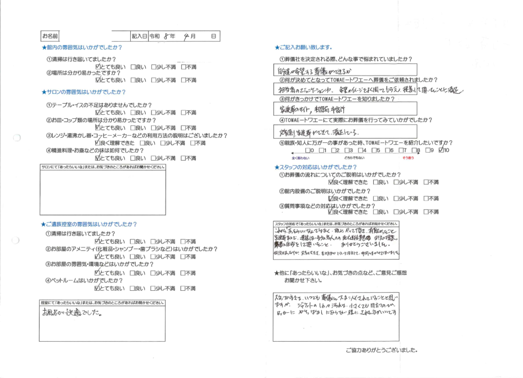 自分達が希望する葬儀ができて満足(鳥栖市)N様 2026年4月26日 クリックで画像を拡大できます。 葬儀形式 1日葬(10名様規模) エリア 鳥栖市 利用斎場 家族葬邸宅トワエ(宿町店) 記入者名 N様 スタッフより N様、アンケートご回答有難うございます。トワエでは皆様のお声を聞きながら、後悔しないお葬儀を提供することをスタッフ一同心掛けております。そしてコミュニケーションや希望やイメージをよく聞いてとらえ、提案して頂いたことに満足とのお言葉を頂戴し大変嬉しく思っております。N様、お忙しい中に貴重なお言葉を頂き誠に有難うございました。